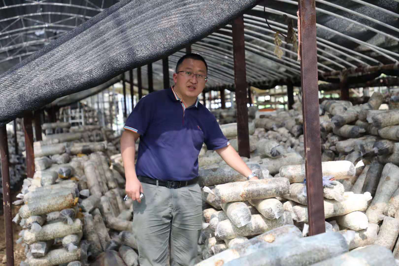 廖恒等察看食用菌生產(chǎn)車間